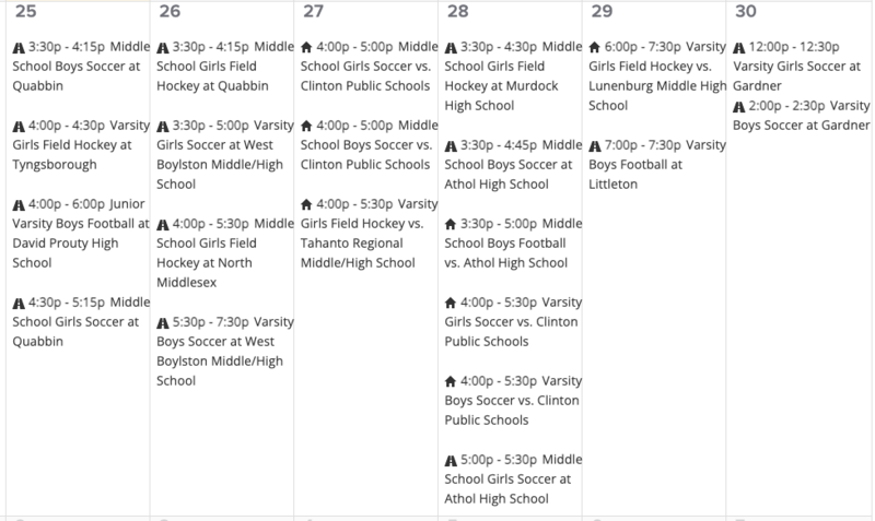 | Tuesday, September 26 | 7th Grade Assembly--Guest Speaker on the Quabbin Reservoir Ecosystem |