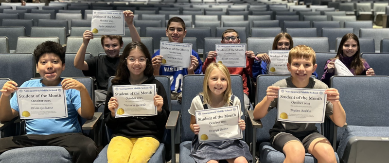 Congratulations to our newest Students of the Month! On Thursday, October 26, the NMS student body and staff gathered in the Safka Auditorium to celebrate our first group named Students of the Month! These students, selected by staff members, are chosen because they exemplify the core values of Be Nice, Work Hard, No Excuses, and Good Choices, which are the foundation of NMS's Shared Expectations. Through these building-wide expectations, students learn positive decision making and build skills in successful participation in classrooms and common spaces, which create spaces where students can thrive, unimpeded, academically. Congratulations to (back row, left to right) Tyler Maxwell, Matt Basil, Joey Tomasetti, Kirstyn Arsenault, Isabelle Buzzell; (front row, left to right) Olvin Galeano Erazo, Victoria Gentile, Evelyn Quinn, and Dylan Bobka. Congratulations to all of our Students of the Month and thank you to the faculty / staff for taking the time to identify students deserving of the recognition!
